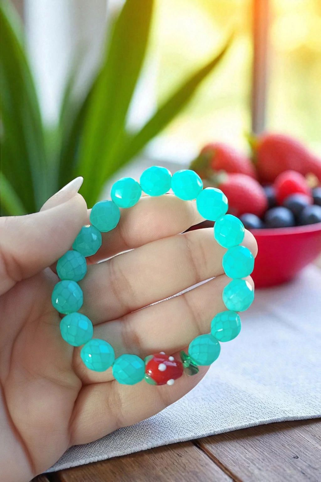 Un diseño fresco, vibrante y lleno de encanto. Esta pulsera elasticada hecha a mano con cristales checos turquesa y dije de frutilla es el toque divertido que necesitas para elevar cualquier look.